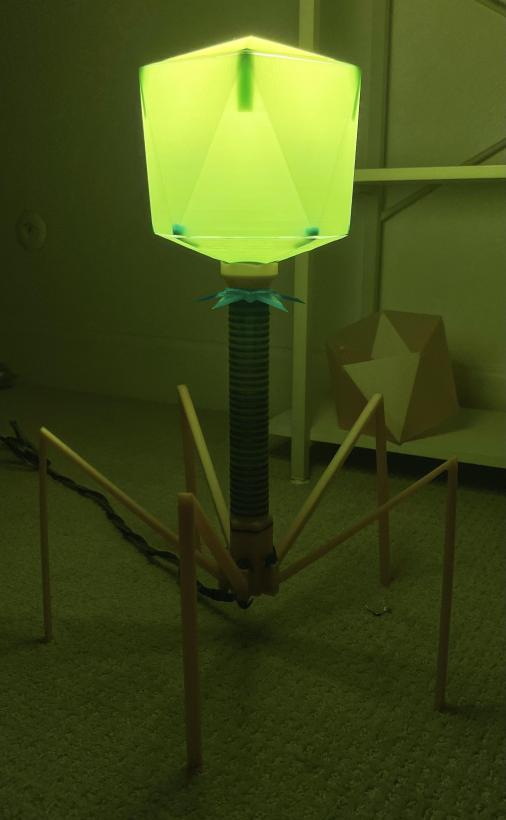 This is a lamp inspired after a bacteriophage. The bulk of this project is 3D printed, including flexible filament (TPU) featured here as the blue bits. The head of the bacteriophage, the lamp shade, is printed from glow-in-the-dark PLA in 3 pieces and held together with TPU fittings. The stem is composed of a wooden pole surrounded by the same pink PLA that the legs are printed with. The base of the stem is held together by screws. The wooden pole contains a hole through the length, for the lamp cord. The lamp cord was separated, shielded with paracord, and twisted to model the look of a double-helix.